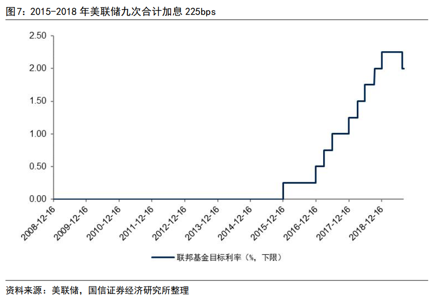 二是加息阶段,累计九次加息,利率上调225bps。美联储于2015年12月首次加息,到2018年底合计加息九次,联邦基金利率目标区间由0~0.25%升至2.25%~2.50%。美联储taper结束一年之后才正式启动加息,给予市场充分的预期和反应时间。2019年8月美联储进入降息周期。