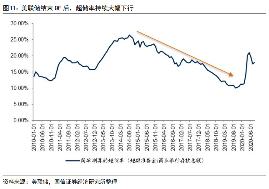 我们根据美联储披露的超额准备金规模以及商业银行存款总额计算超储率(超额准备金/存款总额),次贷危机以来美联储扩表期间超储率持续上行,最高达到2014年三季度的26%,扩表结束后超储率持续下行,2017年10月启动缩表后超储率下行态势加剧,降到2019年9月末的10%。