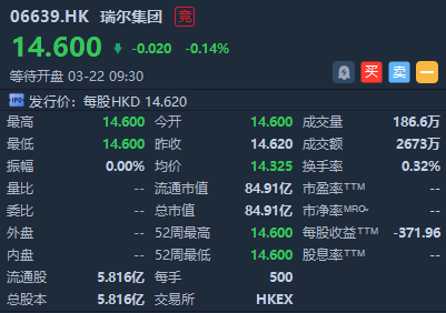 华盛资讯3月22日讯,口腔医疗机构瑞尔集团 $00816.HK 首挂低开0.14%,尾盘收跌5.61%,一手账面浮亏410港元,全日成交额8433万港元,最新总市值超80亿港元。