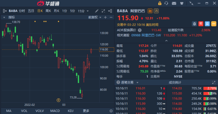 华盛资讯3月22日消息,美股盘中,热门中概股普遍走高。截至发稿,阿里巴巴(BABA)涨近12%,哔哩哔哩(BILI)涨超14%,知乎(ZH)涨超11%,拼多多(PDD)涨超10%,叮咚买菜(DDL)涨超9%,贝壳(BEKE)涨近8%。