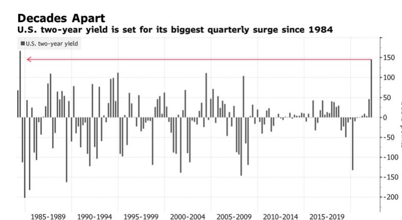 在美联储主席鲍威尔(Jerome Powell)发表激进的货币政策言论后,短期美债录得近40年来最差季度表现。2年期美债收益率领涨整个市场,截至发稿,2年期美债收益率上涨5个基点,至2.17%。