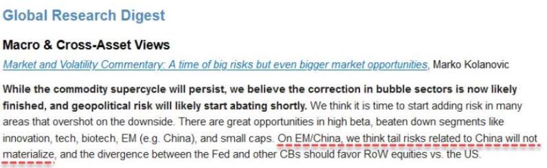 然而,就在几天后,摩根大通驻纽约全球研究联席主管、广受关注的量化专家Marko Kolanovic发出了买入“受挫”股票的呼吁,包括中国、新兴市场、科技、生物科技和小盘股。Marko Kolanovi表示,“我们认为与中国有关的尾部风险不会实现。”