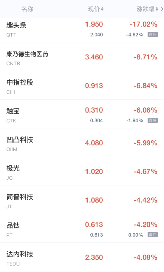 趣头条跌超17%,极光跌超4%。