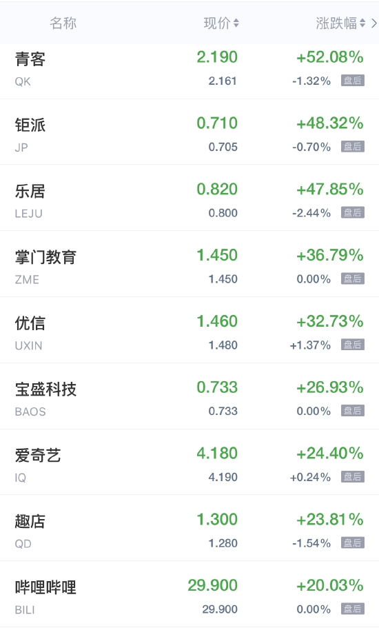领涨中概股列表: