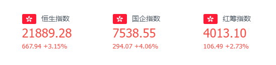 截至3月22日收盘,恒生指数收涨3.15%,报21889.28点;恒生科技指数收涨5.37%,报4653.70点;国企指数涨4.06%,报7538.55点;红筹指数涨2.73%,报4013.10点。