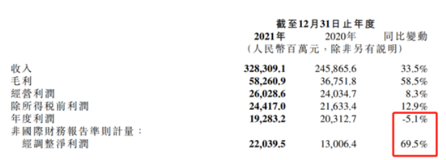 财报显示,2021年总收入3283亿元,同比增长33.5%;经调整后净利润220亿元,同比增长69.5%;智能手机业务方面,2021年,全球智能手机出货量同比增长30%,达到190.3百万台,收入2089亿元,同比增长37.2%;智能电动汽车业务进展超预期,目前研发团队规模已超过1000人,仍预计在2024年上半年正式量产。