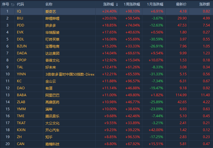受阿里小米回购消息提振,多只热门个股现两位数涨幅。“电商三巨头“阿里、京东、拼多多合计涨逾3200亿。纳斯达克金龙指数大涨7.84%,收于7,651.23点。