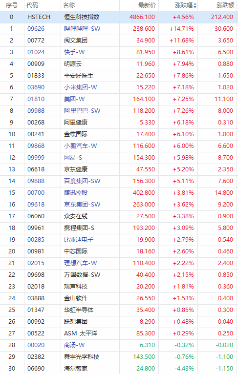 哔哩哔哩大涨超14%,领涨科技股;阅文集团涨超11%,快手超8%,小米、美团、阿里巴巴涨超7%,小鹏汽车涨6%,网易、百度集团涨超5%,腾讯涨超3%,重返400港元。