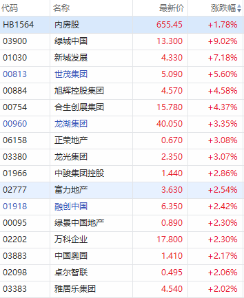 华盛资讯3月23日消息,港股房地产板块拉升,绿城中国涨超9%,新城发展涨超7%,世茂集团涨超5%,旭辉控股集团涨超4%,龙湖集团涨超3%。消息面上,哈尔滨市拟废止2018年实行区域性房地产限售政策有关文件。