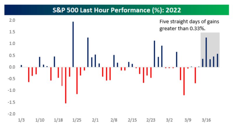 “这种尾盘上涨,出现一两天可能并不少见,但连续五天出现类似涨幅是极其罕见的,”Bespoke策略师团队在题为《最后一小时的狂买》(Last Hour Buying Spree)的报告中写道。