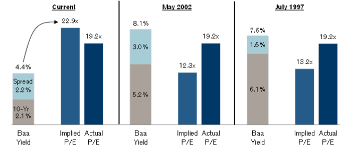 Golub在一份报告中写道:“令人惊讶的是,如今的资本成本比那些时期要低得多,这支撑了当前股票估值更具吸引力的观点。”