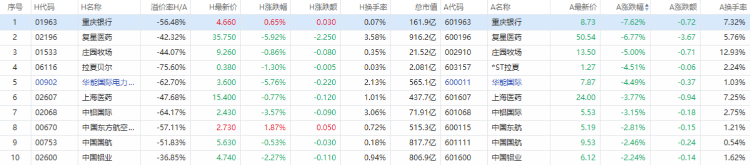 重庆银行A股跌7.62%,H股涨0.65%,复星医药A股跌6.77%,H股跌5.92%,华能国际电力股份A股跌4.49%,H股跌5.76%。