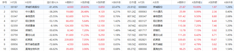 截至发稿,中兴通讯A股涨停,H股涨26.48%,京城机电股份A股涨停,H股涨20.83%,泰格医药A股涨9.5%,H股涨9.01%。昭衍新药A股涨7.84%,H股涨5.64%。药明康德A股涨7.25%,H股涨10.78%。