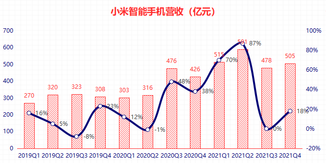 作为小米集团的支柱业务,小米智能手机业务在2021年Q4实现营收505亿元,同比增长了18%。在Q3营收跌破500亿大关后,小米Q4再次攻克难关,表现明显回暖。