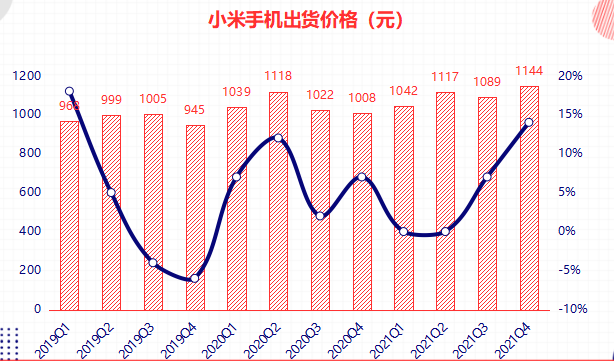 此外更为重要的价格方面,小米手机在2021Q4平均出货价升至1144元,同比增长了14%,创出历史新高。在量“艰难”增长的情况下,价格的提升成为小米手机业务营收增长的最大功臣。