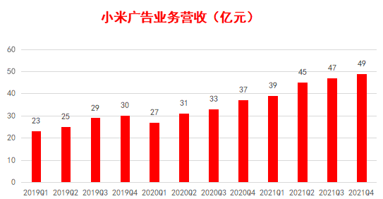 2021年Q4,小米互联网服务业务营收72.7亿元,同比增长18%,其中广告业务实现营收49亿元,同比大幅增长了32.4%,再创单季新高。在整个广告大盘整体承压的背景下,小米的广告业务逆势稳健增长,显示了其未来的发展潜力。
