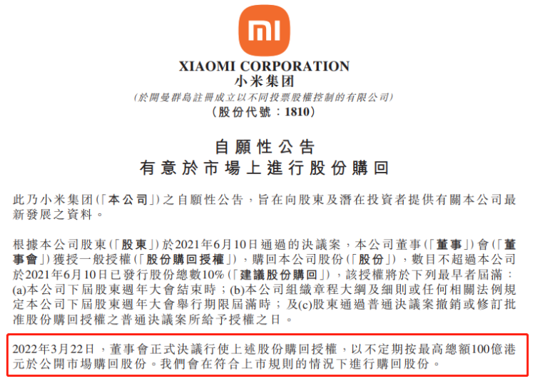小米董事会认为,公司现有财务资源足以支持股份回购,同时维持稳健的财务状况。于现况下进行股份回购可展示公司对自身业务展望及前景充满信心,且最终会为公司带来裨益及为股东创造价值。