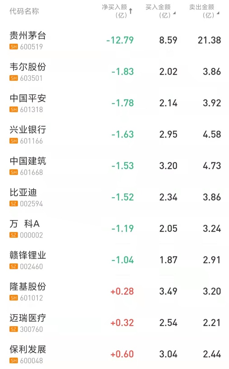 今日北上资金净卖出贵州茅台 $600519.SH 12.79亿元,净卖出韦尔股份 $603501.SH 1.83亿元。