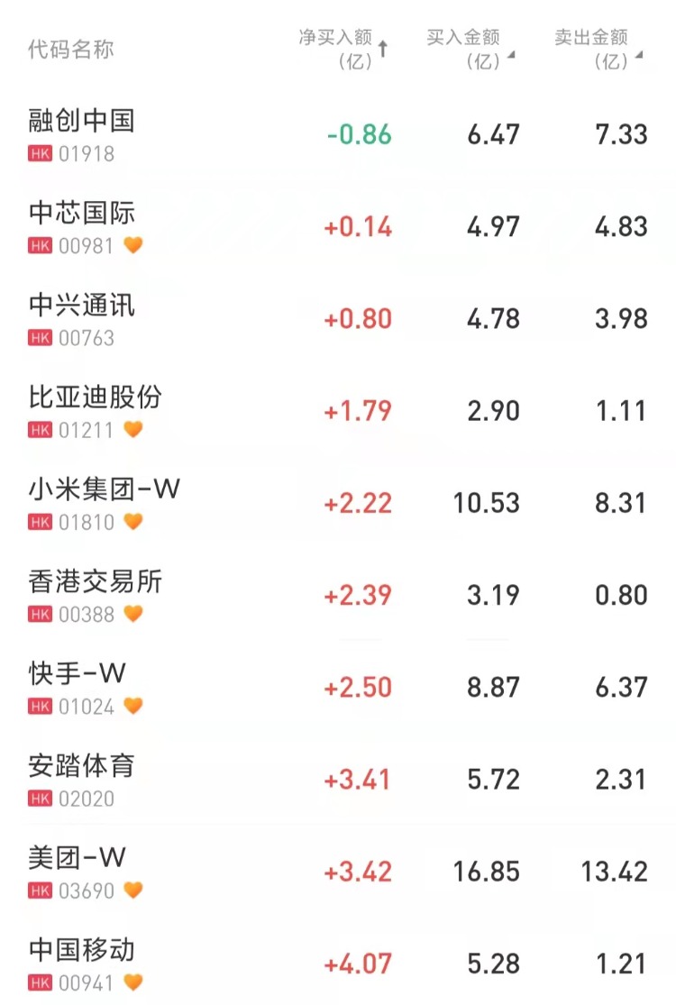 南下资金净卖出融创中国 $01918.HK 0.86亿港元,为今日卖出之最。