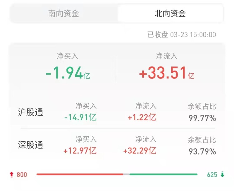 北上资金今日净卖出1.94亿元,沪股通净卖出14.91亿元,深股通净买入12.97亿元。上一交易日净卖出9.22亿元。