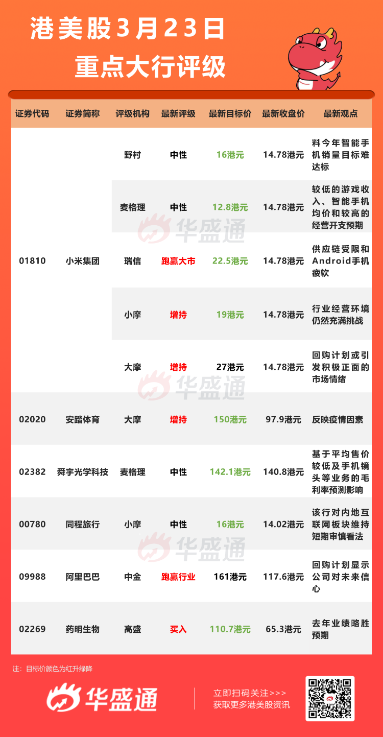 摩根大通发表研究报告指,小米集团去年第四季经调整溢利较市场预期及摩通预测分别9%及13%,主要受惠于互联网服务业务毛利提升及智能手机平均售价更高。摩通指,中国智能手机行业下滑,消费放缓及互联网广告增长有限,同时新兴市场或因高通胀而承压,认为行业经营环境仍然充满挑战,令小米目前市盈率已降至11.8倍,为上市以来最低水平。虽然小米近期与其他科技股一同被市场抛售,但摩通相信公司面对ADR上市、互联网平台法规、中国国内高风险敞口等中国科技股常见风险较小,认为目前估值及运营水平健康,提供较有吸引力的风险回报。