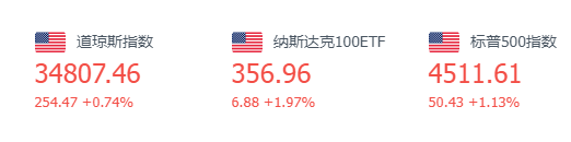 周二美股三大股指集体收涨,道指 $DJI 涨0.74%,报34807.46点;标普500指数 $SPX涨1.13%,报4511.61点;纳指 $IXIC涨1.95%,报14108.82点。