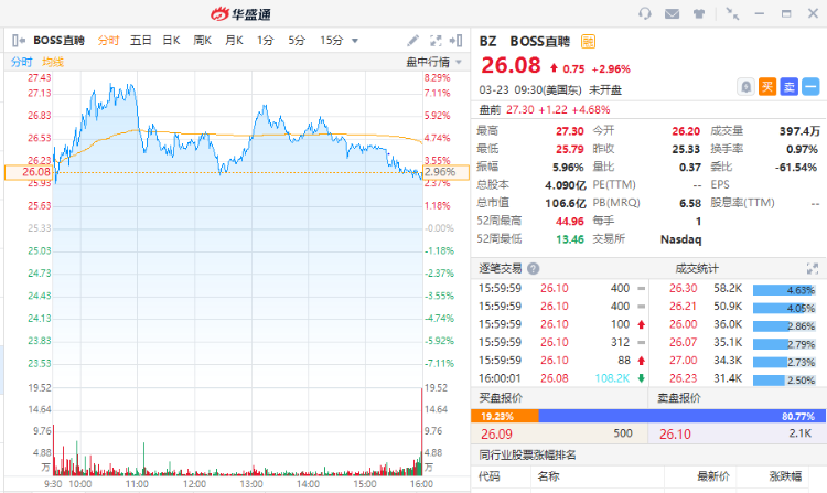 Boss直聘 $BZ 盘前涨近5%,Q4同比扭亏为盈