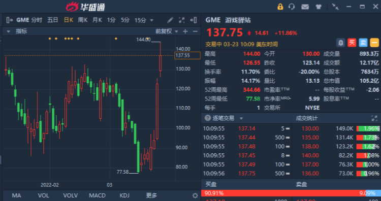 华盛资讯3月23日消息,WSB概念股部分走高,游戏驿站(GME)涨超11%,Sundial Growers(SNDL)、Tilray(TLRY)涨超4%,AMC院线(AMC)涨超3%,高斯电子(KOSS)涨超2%。