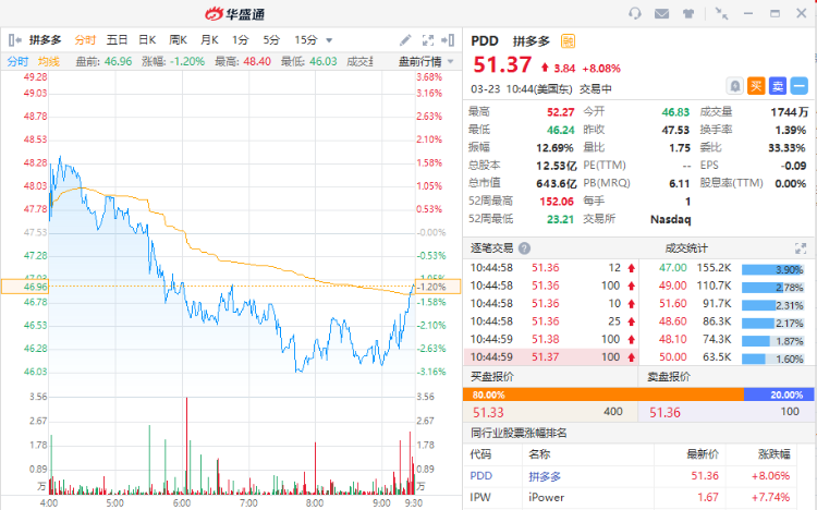 华盛资讯3月23日消息,热门中概股部分走高,爱奇艺(IQ)涨超8%,拼多多(PDD)涨超8%,万国数据(GDS)涨超11%,Boss直聘(BZ)涨超6%,叮咚买菜(DDL)涨近5%,阿里巴巴(BABA)涨近2%。