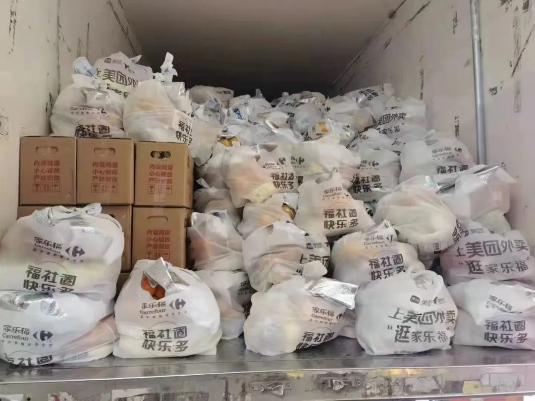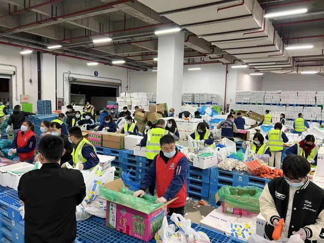 为克服配送人员不足,浦东新区调配250名区镇两级机关干部作为志愿者分拣配送由浦商集团提供的肉类、蔬菜。分拣完成后统一由志愿者自驾交通工具送到小区门口,再由村居干部和社区志愿者在小区内配送。经过7个多小时的冒雨奋战,最后一批物资在居民晚饭前配送到户。