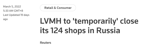 但在推特上,有网友提醒道,路易威登目前已撤离俄罗斯市场。据路透社3月4日报道,酩悦·轩尼诗-路易·威登集团(LVMH)一名发言人表示,将从3月6日开始“暂时”关闭其在俄罗斯的124家门店。
