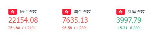 截至3月23日收盘,恒生指数涨1.21%,报22154.08点;国企指数涨1.28%,报7635.13点;红筹指数跌0.38%,报3997.79点。恒生科技指数涨超2%,哔哩哔哩涨超10%,阿里涨6.72%,快手涨超6%。