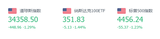 3月23日收盘,美股全线下跌,道指跌1.29%,报34358.5点;标普500指数跌1.23%,报4456.24点;纳指跌1.32%,报13922.6点。