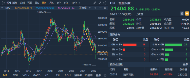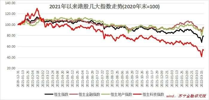 2020年末至2022年3月18日,恒生指数累计下跌21.37%,既套牢了一批早期投资者,又让尚未入场的投资者跃跃欲试。分行业来看,恒生金融指数累计下跌4.85%,恒生地产指数累计下跌7.05%,恒生科技指数累计下跌46.77%,可见,科技互联网板块的大幅下跌是恒生指数的主要拖累因素。