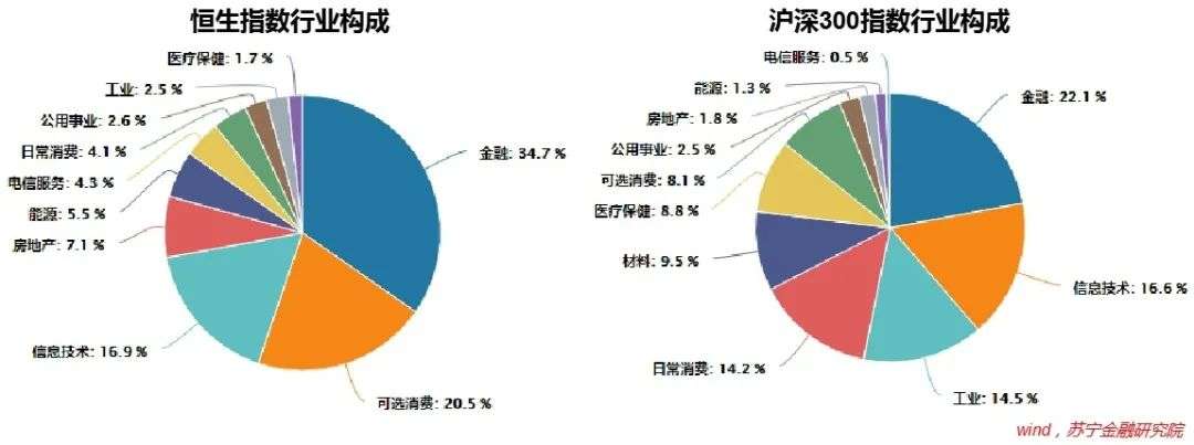 当前,按最新自由流通市值计算,恒生指数前十大权重股分别为腾讯控股、阿里巴巴、汇丰控股、友邦保险、建设银行、美团、香港交易所、工商银行、京东集团和中国移动,调整后合计占比约51%。从行业构成来看,截至2022年3月18日,前四大行业分别是金融(34.7%)、可选消费(20.5%,主要是阿里、美团、京东、比亚迪、安踏、李宁等)、信息技术(16.9%,主要是腾讯、网易、小米、联想等)和房地产(7.1%)。