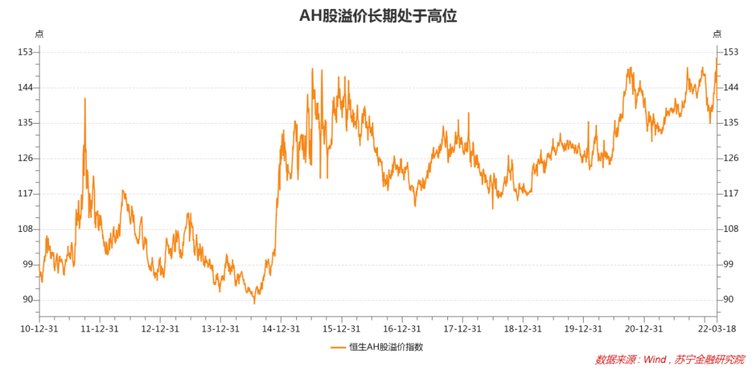 从数值上看,2021年以来,AH溢价指数基本在130-150点之间浮动,意味着同一只上市公司的A股价格平均比港股价格高30%-50%。具体到个别股票上,A股价格甚至高达H股价格的4倍或5倍水平。