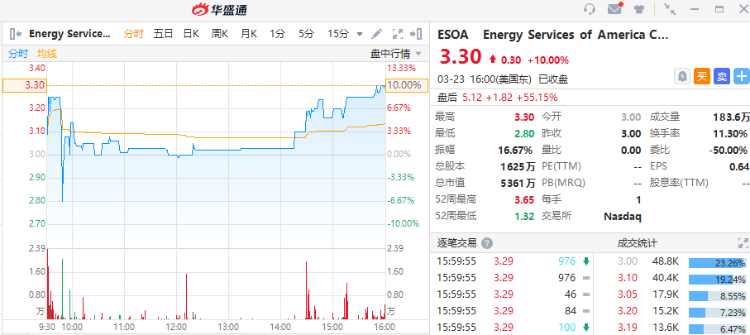 华盛资讯3月24日消息,美国能源服务公司昨日从OTC转板到纳斯达克,代码为“ $ESOA ”。转板首日表现良好,收涨10%,盘后大涨超50%。