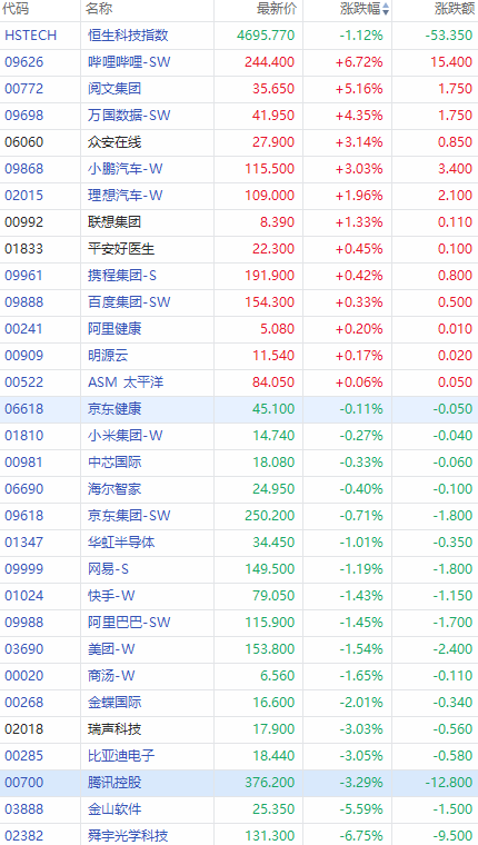 舜宇光学跌超6%,金山软件跌超5%,瑞声科技跌超3%,腾讯控股跌超3%,美团跌超1%。