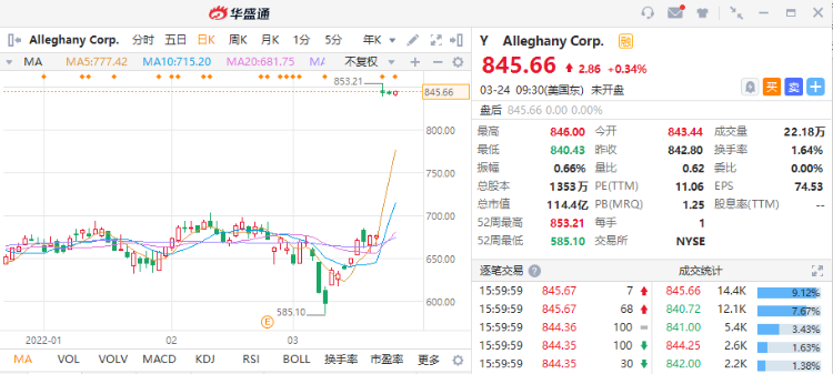 1、巴菲特溢价买!“迷你伯克希尔” Alleghany $Y 本周3日涨25%,股神看到了什么?