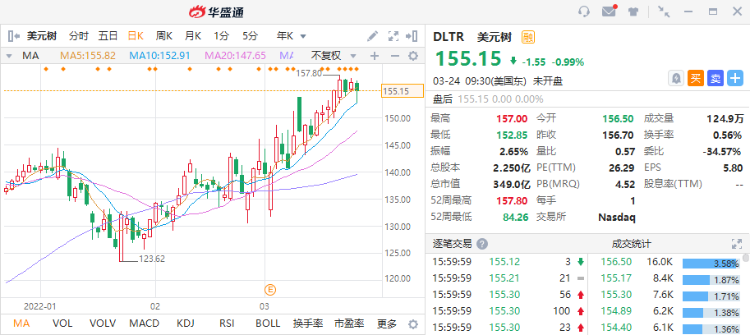 - 年内美股大盘疲软,但美元树股价震荡走高,盘中触及历史最高价157.8美元。而从去年11月23日宣布提价计划以来,该股股价上涨了约16.53%。