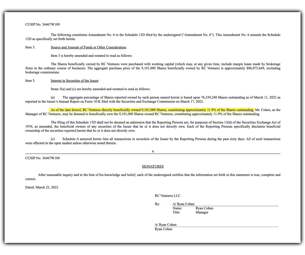 根据提交给美国SEC的文件和美媒Barron 's的数据,Cohen的RC Ventures以96.81美元至108.82美元的价格买入该股,平均价格约为101.76美元。RC Ventures目前共持有910万股游戏驿站,占流通股的11.9%。