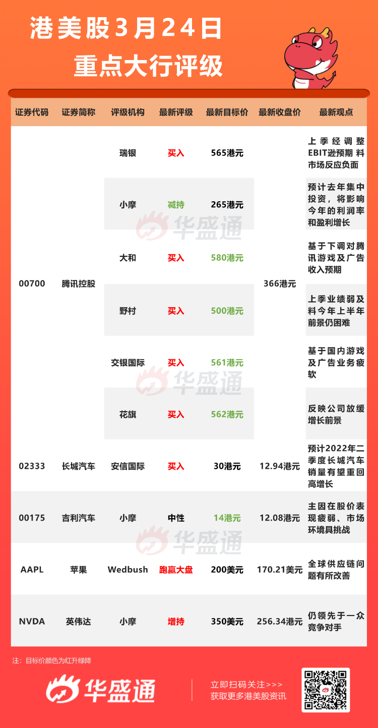 花旗发布研究报告称,维持腾讯控股“买入”评级,目标价由634港元下调至562港元,以反映公司放缓增长前景。公司去年总收入及利润同比增8%及跌25%,管理层预计今年全年能完全消化因内地游戏保护措施而产生的负面影响,线上广告将于今年后期恢复增长。腾讯欣然接受中国互联网行业新模式的转变,目前已主动优化成本,并致力投资关键战略增长领域,如视频账号、国际游戏和SaaS。
