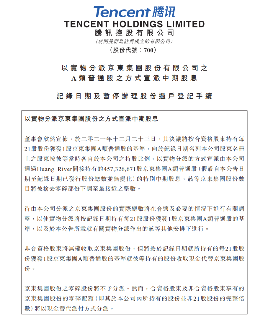 公告显示,腾讯股东每持有21股腾讯股票,将获发1股京东股票。