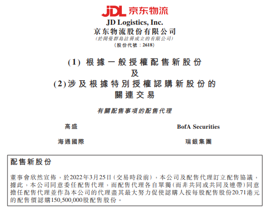 京东物流(02618)公布,于2022年3月25日,该公司及配售代理订立配售协议,拟透过配售代理按每股配售股份20.71港元配售1.505亿股配售股份。
