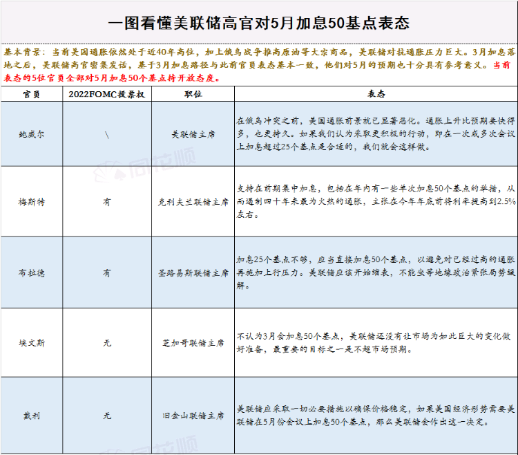 在周一鲍威尔的讲话中,一个小细节尤为引人瞩目:在他结束正式讲话后,主持人询问鲍威尔什么情况下会令美联储在5月份不加息50基点。鲍威尔的回答是,“什么会阻止我们?没有”。同时就在这周,美联储一众高官密集表态,截至目前,包括鲍威尔在内五名官员对5月加息均持开放态度。