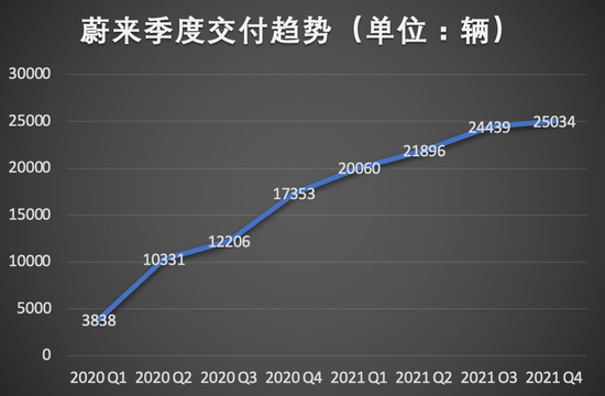 财报显示,去年第4季度,蔚来累计交付2.5万辆,环比上个季度增长2.4%,同样创下近7个季度的最低增幅。而且这种销量增长的瓶颈,在蔚来进入2021年就一直存在。