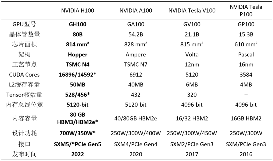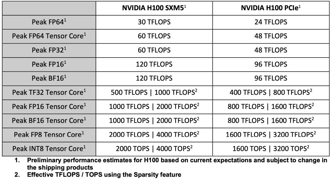 ▲H100 Tensor Core GPU的性能规格