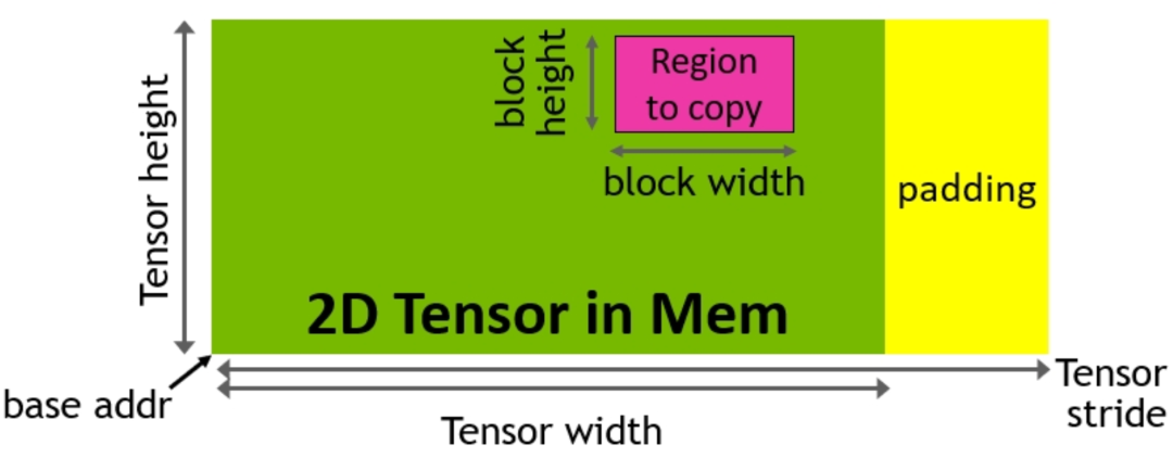 在这一新的TMA操作中,使用张量维度和块坐标指定数据传输,而不是简单的按数据地址直接寻址。TMA通过支持不同的张量布局(1D-5D张量)、不同的存储访问模式、显著降低了寻址开销并提高了效率。