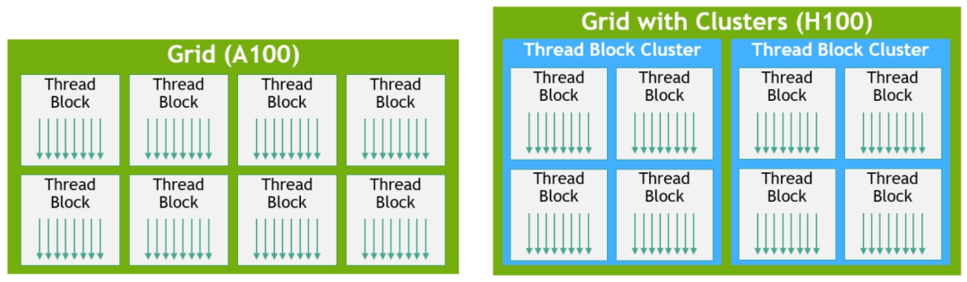 Hopper架构中引入了一种新的线程块集群机制,该机制可以跨SM单元进行协同计算。H100 中的线程块集群可在同一GPC内的大量SM并发运行,这样对较大的模型具有更好的加速能力。