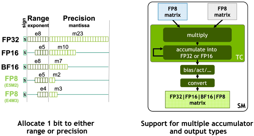 Hopper架构的新一代流式多处理器引入了FP8 张量核心 (Tensor Core)来加速AI训练和推理。FP8张量核心支持FP32和FP16累加器,以及两种FP8 输入类型(E4M3和E5M2)。